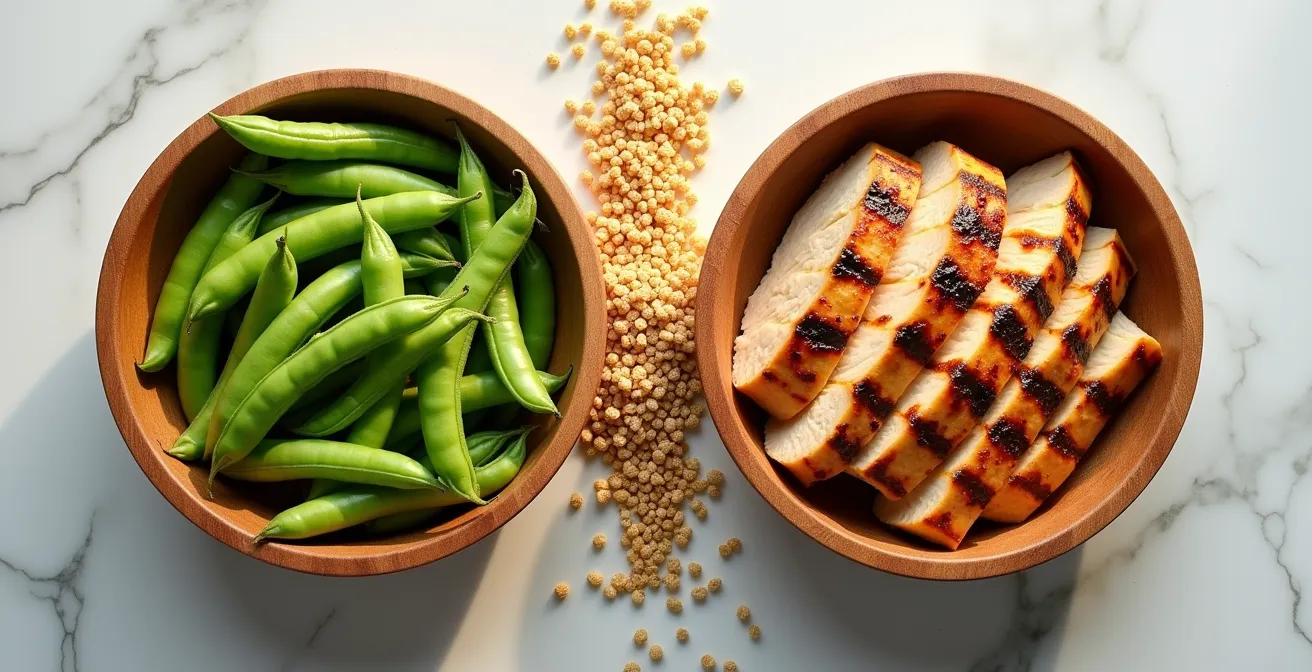 Contrariamente alla credenza comune, la questione non è scegliere tra proteine animali “complete” e vegetali “incomplete”. La vera strategia per la massa muscolare e la salute metabolica risiede nell’assemblaggio aminoacidico intelligente. Questo approccio biochimico trasforma il cibo in “mattoni” da combinare, dimostrando che l’efficienza di una proteina dipende da come viene integrata durante la giornata, superando la rigida dicotomia tra fonti animali e vegetali.